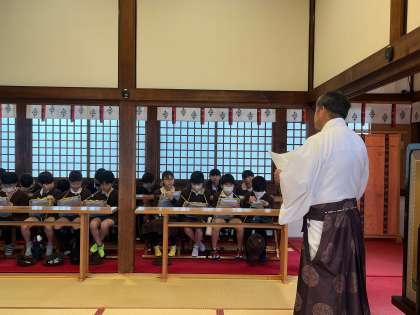 4年生の2学期に社会科で天神祭の学習をしました。子どもたちはもともと天神祭が好きでしたが,学習するにつれてもっと知りたいことが出てきました。そこで,天神祭と関係のある大阪天満宮にお話を聞く機会をいただきました。