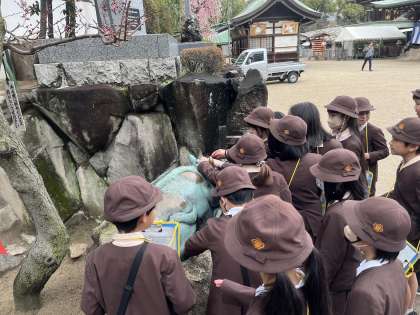 本日は2回目で,子どもたちが大阪天満宮へお邪魔させていただきました。大阪天満宮の歴史やお参りの仕方など,事前に子どもたちが質問していたことに対して丁寧に答えていただきました。本日は,ちょうど盆梅展の催しもやっていて,歴史ある梅や刀を見せてもらい,「100年も咲いてるねんて!」と驚きつつ,昔からあるものに興味を持っていました。