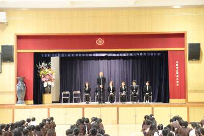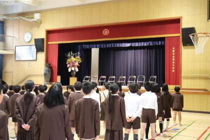 まずは、新しく転任されてきた教職員の着任式です。新しく菅北小学校へ赴任された教職員の皆さんを校歌でお迎えました。