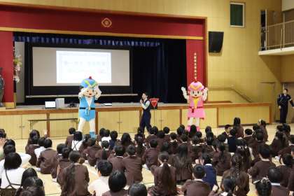 その後、曽根崎ロータリークラブと中央ロータリークラブからのランドセルカバーと防犯ブザーをいただきました。贈呈式に続いて、曾根崎警察の方が、交通安全指導と防犯指導をしてくださいました。子どもたちは時には真剣な表情で話を聞き、安全に関する意識が高まった様でした。1年生の下校時には、多くのお巡りさんに下校の見守りをしてくださいました。