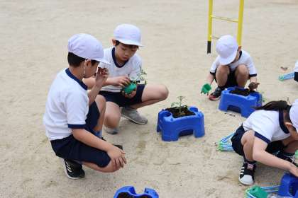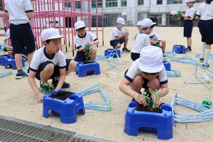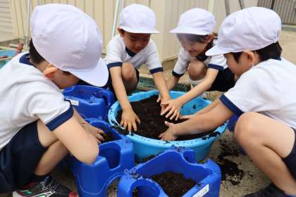 おいしいミニトマトになるように、子どもたちは「気持ちいい〜」といいながら、しっかりと土と肥料を混ぜていました。苗を植えるときには、夏に実がなるのを楽しみにしながら優しくていねいに植えていました。