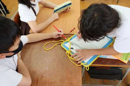 本日は、快晴で過ごしやすいお天気でしたが、子どもたちは雨の日の運動場の写真を見ながら、地面のでこぼこと水の流れ方の関係を調べています。
