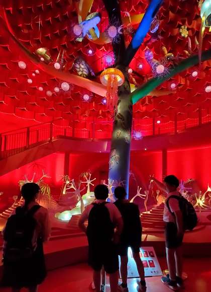 まず、「太陽の塔」の内部を見学して、岡本太郎氏の世界観に触れました。子どもたちは独特な色づかいや表現法に驚いていました。