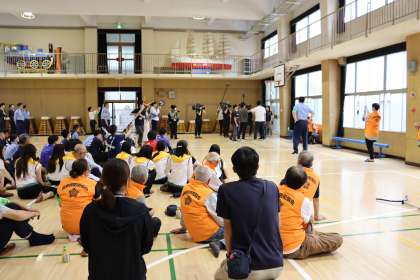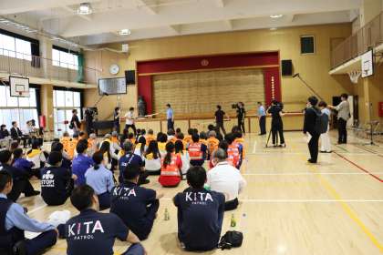 今日は、子どもたちが安全に学校生活を送れるように、普段から見守ってくださっている警察官や地域の方々と総勢60名の皆さんと一緒に、研修を行いました。