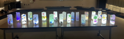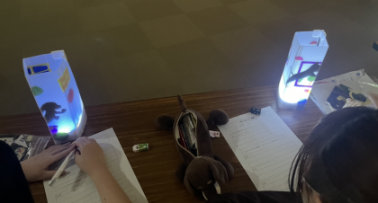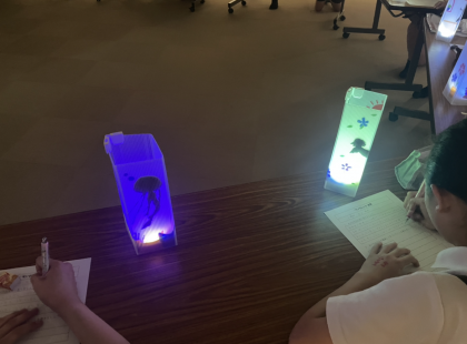 図画工作科「すてきな明かり」の学習で作ったランプシェードの振り返りや鑑賞を行いました。暗い部屋で自分が作ったランプシェードにLEDライトを当て、上手くできたところやこれからの作品に活かしていくところを振り返りました。また、友達の作品を鑑賞するときには、「○○さんのここがすごい!」「この作品のこういうところを参考にして次の作品をつくろう。」などの声も聞こえました。
