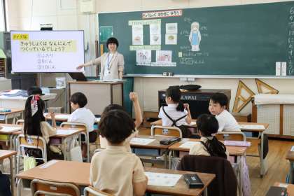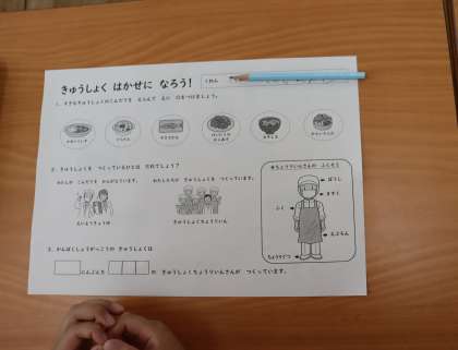 今日の栄養指導では「きゅうしょくはかせになろう!」というめあてで、給食を作ってくれている人や給食室の中について学習しました。