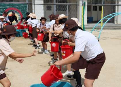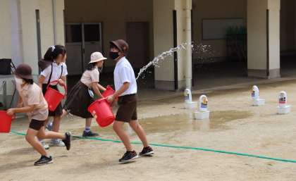 5年生は水バケツリレーを行いました。びしょびしょになりながら、炎に見立てた人形に向けてバケツの水をかけ、消火活動訓練を行いました。