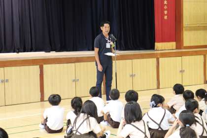 “3つのかも”は「車がくるかも」「バイクが来るかも」「自転車が来るかも」です。曲がり角を曲がるときに、向こうから何か来るかもしれないという気持ちを持ってほしいというお願いでした。大阪は、とても交通事故が多いそうです。夏休みも近づいています。交通ルールを守り、安全に過ごしてほしいと思います。