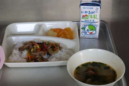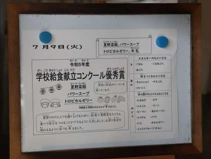今日の給食は 夏野菜飯、パワースープ トロピカルゼリー、牛乳 でした。