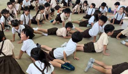 次に,進化じゃんけんをしました。あざらしから始まり,カニ,くま,人間とじゃんけんに勝つと姿が変わっていきます。体も動かせて,どちらの学年もとても楽しく遊んでいました。