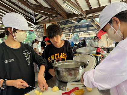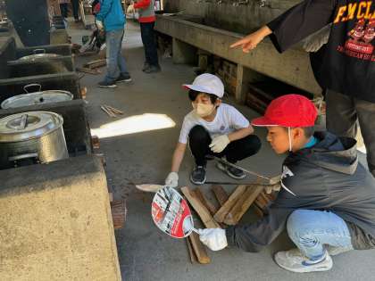 グループで、火をおこす担当と食材を切る担当とに分かれて、カレーライスを作ります。