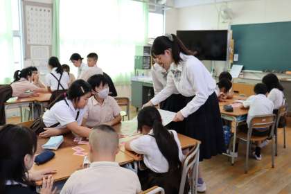 今日は、高校3年生のみなさんが体験学習の一環として、4年生に授業をしてくださいました。
