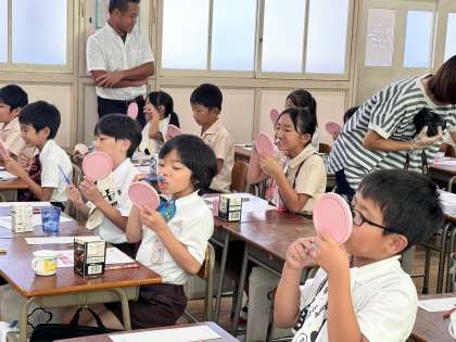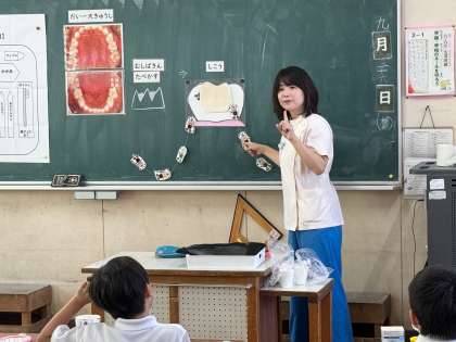 2年生で歯みがき指導を実施しました。大阪市教育委員会から歯科衛生士さんが来てくださり、学校歯科医の樋口先生と一緒に指導していただきました。歯垢染色液で前歯の歯垢を染め出し、歯垢を取るための効果的な歯みがきの仕方やむし歯になりやすい第一大臼歯のみがき方を学びました。集中してお話を聞き、これからがんばることを感想にしっかり書くことができました。