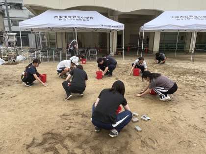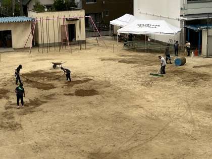 昨日の急なお願いにもかかわらず,たくさんの新聞紙を持ってきていただいたおかげで,5・6年生が運動場の水を取ってくれて,整地することができました。