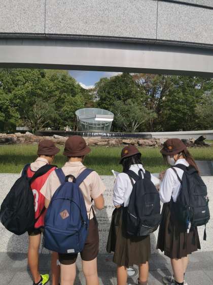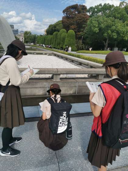 活動班ごとのオリエンテーリングでは、平和記念公園内の像や石碑などを回り、心に残った言葉をメモしています。