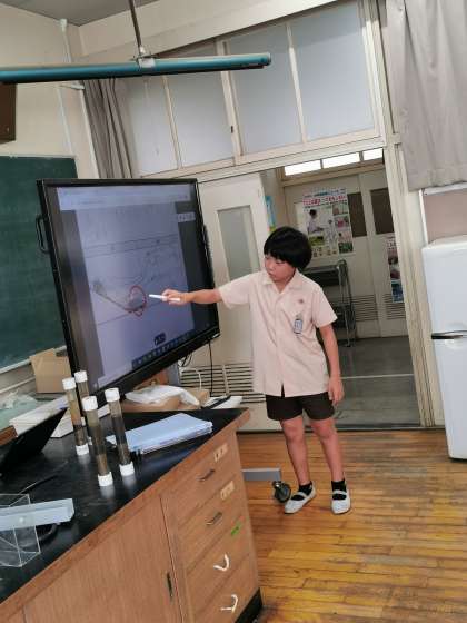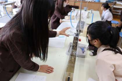菅北小学校のボーリング試料を元に、地層のつくりについて学んだ子どもたちは、地層のでき方を明らかにするために、実験を行い、礫砂泥の重さや大きさの違いや水の流れが関わっていることを発見していました。