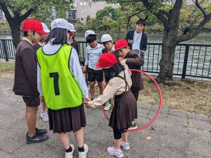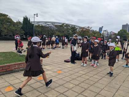 今日は毛馬桜ノ宮公園に全校オリエンテーリングに行ってきました。朝から雨が心配されるお天気でしたので、予定を少し早めて実施となりました。オリエンテーリングがスタートすると、子どもたちはポイントごとに課題をクリアするために、みんなで知恵を出し合いながら協力し合う姿が見られました。また、各班のリーダーがしっかりと指示を出し、メンバー全員がてきぱきと行動することが出来ていました。おかげさまで、雨に濡れることもなく、無事にオリエンテーリングを終えることができました。