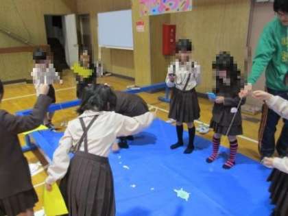 1年生を招待して、2年生がおもちゃランドを開きました。魚釣りやぶんぶんゴマ、ぴょんぴょんガエル、ペットボトルボーリング、うちわで走る車、輪投げ、とんとんずもう、紙コップけん玉をしました。1年生は大喜びで遊びました。2年生はしっかり遊び方を説明していました。