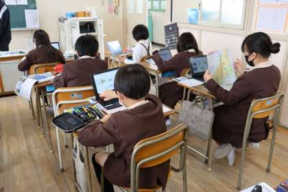 タブレットや教科書、地図帳を使い、日本の地形について調べました。