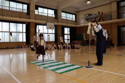 そして、1人ずつ安全に気をつけて歩行する練習をしました。信号機や止まれの標識を意識して取り組むことができ、おまわりさんやあんまち隊の方にほめていただきました!