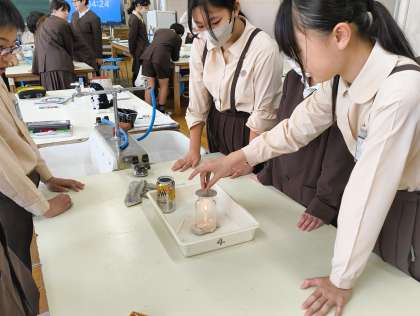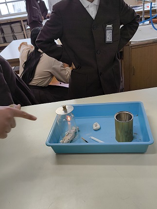 本日6年生になって初めての実験を行いました。児童たちは火の燃え方と空気の関係を調べるために様々なパターンの実験計画を立て、事故の無いように慎重に取り組みました。
