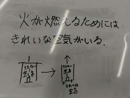 実験では、様々な条件下で火の燃え方を観察し、空気の入れ替わりがどのように影響するかを確認しました。実験後の考察の場面では、班ごとに意見を交流し、ものが燃えるには空気の入れ替わりが重要であるという考えにたどり着いていました。