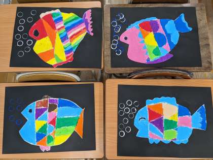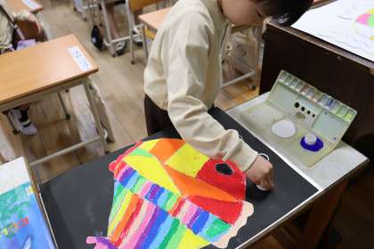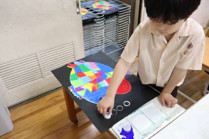 丸い形や三角の形などのうろこの中に、色とりどり塗りこみをしました。「白いところがなくなるまで塗る!」と、とても集中して取り組む姿がありました。最後に、ペットボトルのふたを使って泡を描き完成!仕上がった作品を見て「できた!」と達成感を感じている様子でした。