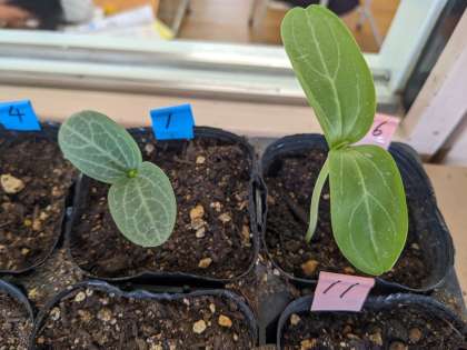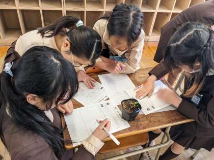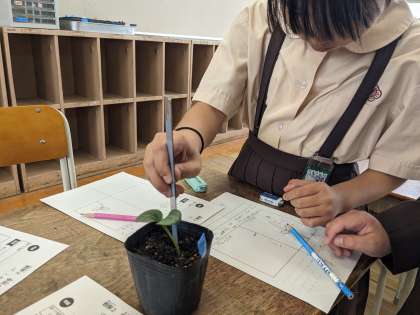4月22日にひょうたんとへちまの種まきをしたビニルポットの周りにたくさんの人だかりがありました。「芽が出てる!」と嬉しそうな声が廊下に響き、温かい眼差しで土から顔を出した芽を見ていました。ひょうたんとへちまの子葉を比べて色や模様の違いを観察しワークシートにまとめていました。まだまだ芽が出ていないものもあります。子どもたちは今か今かと楽しみにしています。