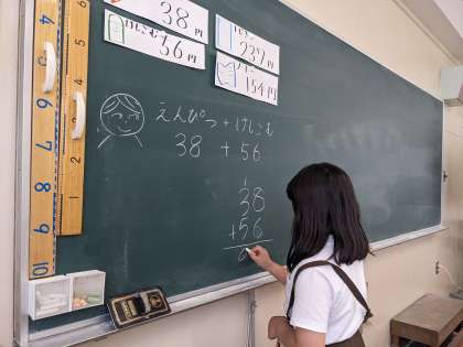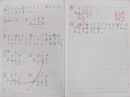 2年生の時に学習したひっ算の仕方を復習し、桁が増えるとどのように計算するのかを考えました。たし算のひっ算は桁数が増えても、位をそろえて書き、今までと同じように一の位から順に計算することに気づき取り組む姿がありました。