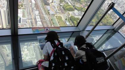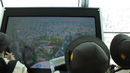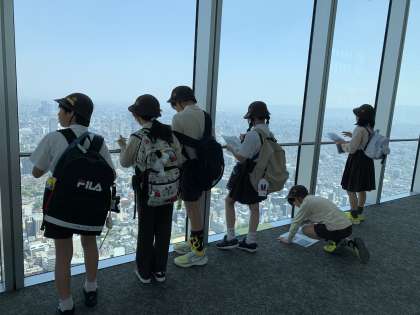 大阪で一番高い建物から、大阪市のまちの様子を調べました。フロアには東西南北のタッチパネルもあり、子どもたちは自分たちで見つけたものを確認していました。