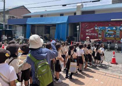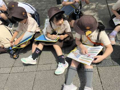 校区の中にある交番・公園などの公共施設や、目印になる建物を確認しながら回りました。また、ワークシートに新しく見つけた建物の名前書き込んだり、友だちに伝えたりしていました。