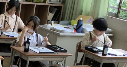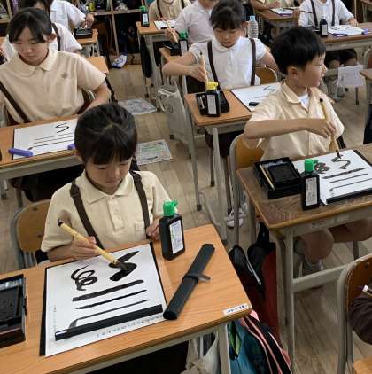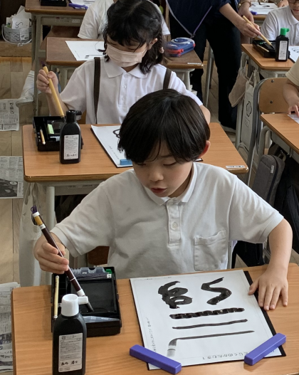 3年生は国語の時間に、初めての習字を行いました。動画を見ながら、右利き、左利きの習字道具の置き方や用紙の押さえ方、筆の持ち方、動かし方を確認しました。腕の使い方を試してから、今度は墨汁をドキドキしながら硯に出して、はじめて筆で書いてみました。みんな真剣な顔で、書き終わった後は満足そうでした。片づけ方も学んで、上手にかたづけられました。