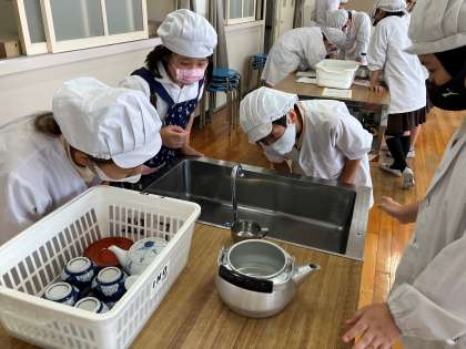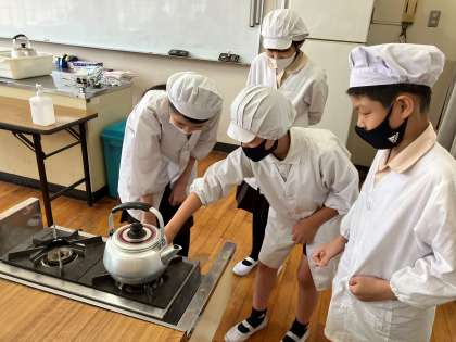 5年1組は家庭科でお湯を沸かしてお茶をいれる学習をしました。調理実習をする前には、身支度を整え、調理に必要なものを準備すること、火を使うときには換気をしたり燃えやす物がないか確かめたりする必要があることなど「安全と衛生」に気を付け、一つ一つ確認しながらすすめました。