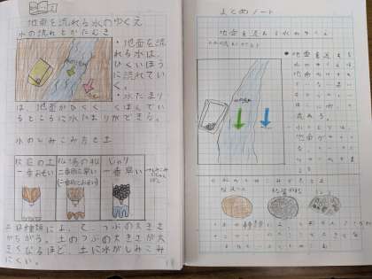 水の流れとかたむきの関係や水のしみこみ方と土の関係について実験をしました。予想を基に実験を行うと、結果に驚いたり疑問を抱いたりと前向きな姿が見られました。学習の最後には、これまで学習した大切なことをイラストや図を使って自分なりに書くことができました。