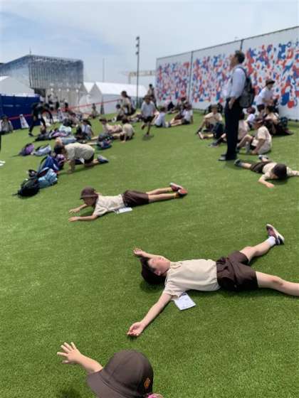 お弁当を食べた後、未来の都市パビリオンに行きました。最後は、エキスポアリーナに入り、芝生に寝ころんで休憩しました!