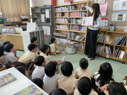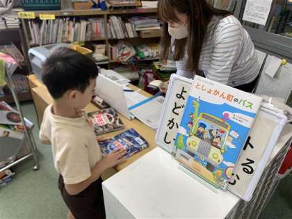 図書の時間に、本の分類について学びました。「としょかん町のバス」という絵本を読み聞かせしていただき、本のラベルの番号の意味を知りました。「この番号の本が好き!」という声が聞こえるなど、本の分類に興味をもっている様子でした。