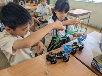 モーターを速く回すにはどうすればよいのかを考えました。乾電池の数が増えるとどのようなつなぎ方でもモーターは速く回るのではないかと予想する子どもたちが多くいました。実際に実験をしてみると、直列つなぎと並列つなぎではモーターの回る速さが異なり「あれ?!」「なんで?!」と驚きと新たな疑問が生まれました。