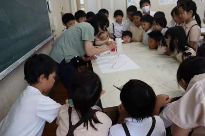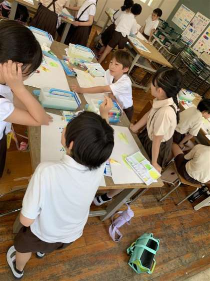 6月5日に図画工作科の学習をしました。白色のパスで2つの池をかき、その中を水でぬってから絵の具を落としたり、はじいたりして色をにじませました。子どもたちは色のにじみを楽しみながら活動をしていました。にじみの池が完成した後は、『何に見えるかな』とお互いの画用紙を見ながらグループで意見交流をしてから、自分のものがたりを考えました。