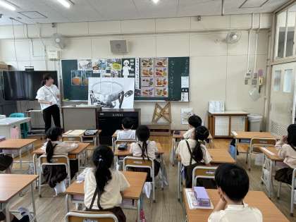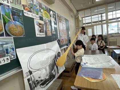 給食用の釜の大きさを教えてもらったり、「スパテラ」というかき混ぜるものを触らせてもらったり、給食についてたくさん教えてもらいました。