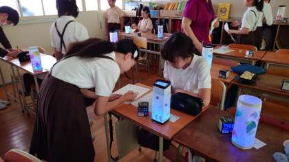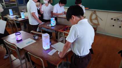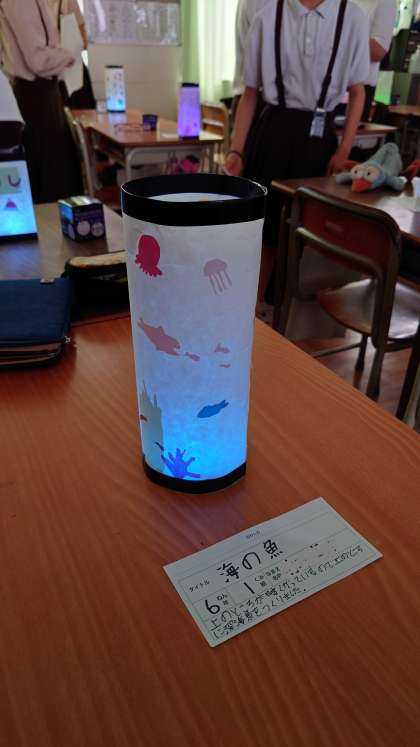 和紙を使って、ランプシェードを作りました。今日は、友だちの作品の鑑賞です。教室を暗くしてランプの明かりをつけたとき、思わず「きれい!」「水族館みたい!」と、口々に言葉がでてきていました。