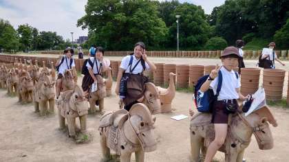 古墳公園では、グループで散策をしました。埴輪のレプリカに乗ったり、同じポーズをしたり、とても楽しんでいました。