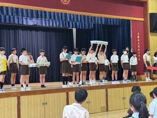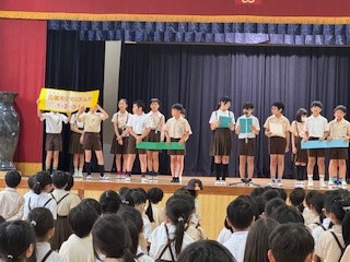 今日から27日までの2週間は、元気モリモリ週間です。今年度は「元気モリモリズムで1・2・3!」のテーマに沿って、一人一人が自分のめあてを持って取り組んでいきます。今日の集会の時間には、保健委員会・運動委員会・給食委員会の代表児童から元気モリモリ週間の取り組みについて発表がありました。最後に1学期のKTS体操をみんなで練習しました。