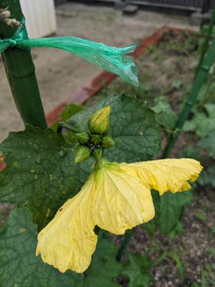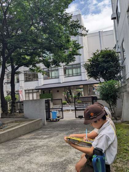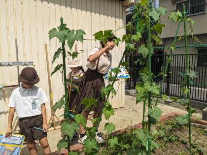 夏が近づいてきたことを暑さで感じ始める日が増えました。春の頃、満開に咲いていた桜も今では青々と葉が茂っています。春から夏にかけて生き物はどうなっているのかを観察しました。「春にあった花が枯れてる。」「緑の葉が増えている。」など、口々に感じたことを話しました。また、春に植えたへちまの種は、今大きく育ち茎は2mを超えています。予想以上の成長にとても驚いていました。へちまは今、つぼみから花開いているものもあります。これからの成長も楽しみですね。