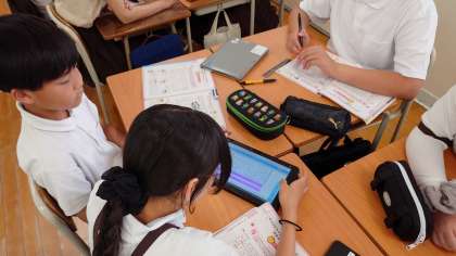 「声が重なるおもしろさを生かして音楽を作ろう」をめあてに、タブレットを使って音楽づくりをしました。班でリズムを考え、リズムに合うように言葉を当てはめました。食べ物をテーマにした班は、「スイ カ シャキシャキ」など、4分音符・8分音符・16分音符に言葉を上手にはめて音楽を作っていました。次回の発表が楽しみです。