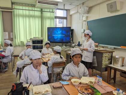給食委員会は、よく噛んで食べることの大切さについて伝えています。給食委員会の児童が給食時間各教室へ行き、よく噛んで食べることの大切さを話した後、給食委員会の児童の合図で学級のみんなで一度一口30回噛んで食べています。