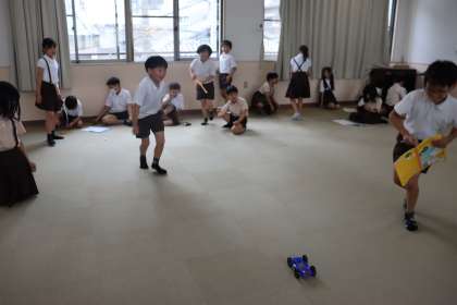 前回は風の力で車を動かしましたが、今回はゴムの力で車を動かす実験をしました。ゴムを伸ばせば伸ばすほど、車は長い距離走ることを予想している児童が大多数でした。しかし、5cm伸ばして走らせた距離と15cm伸ばして走らせた距離との差が予想以上の結果となりとても驚き、ゴムの戻る力を体感しました。