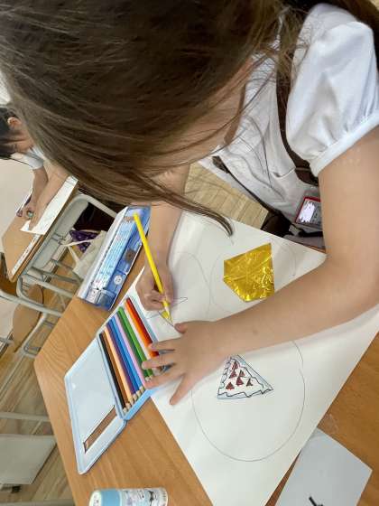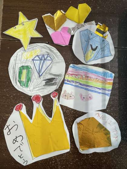 来てくれたお客さんが、「みつけて はっぴいになれる おたから」は何かを考えて、かきました。かいた「おたから」は机や椅子に隠します。