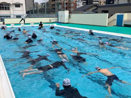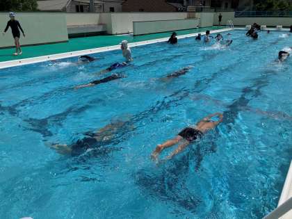 始めに水慣れをしてから、泳力別のコースに分かれて練習をします。5・6年生は「力を抜いて、長く泳ぐ」ことを目標にしています。