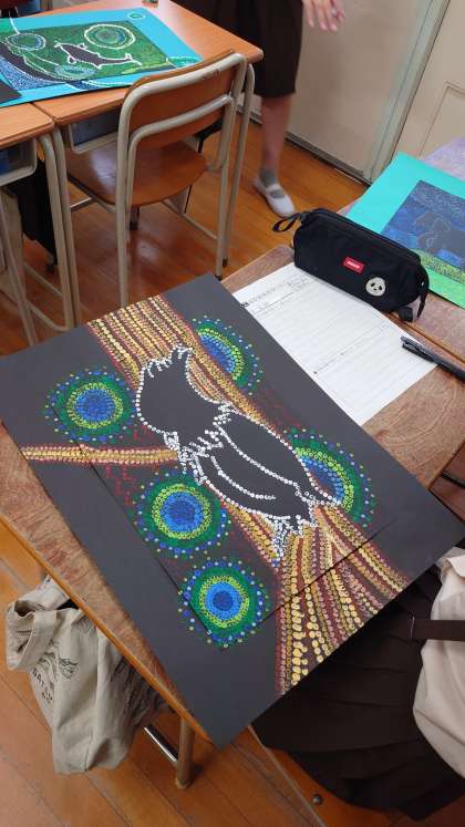 ドットペインティングで作品を描きました。綿棒を使って、点の大きさにもこだわりながらの緻密な作業です。初めは点がつぶれてしまったり、形がいびつになってしまったりと苦戦していましたが、だんだんと慣れてくるにつれて、自分が描きたい生き物を上手に表現することができるようになりました。