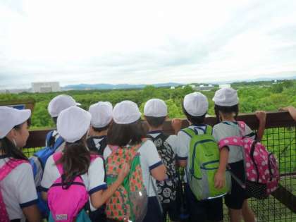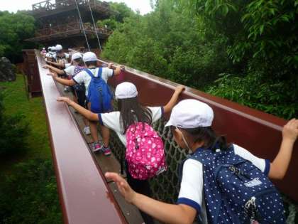 行き先は、万博公園。ソラード(森の空中観察路)を訪れ、高いところから万博公園の森を観察しました。また、アジサイの森ではちょうどアジサイが満開で、その前で学級記念写真も撮りました。
